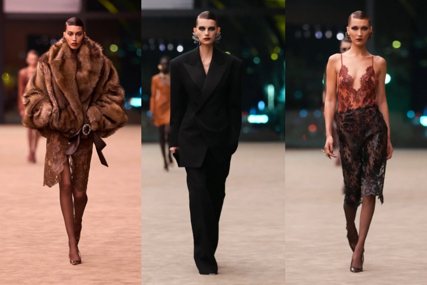 „Saint Laurent“ на Неделата на модата во Париз претстави контрастна колекција од предимензионирани одела и нежни чипкани фустани за својата зимска колекција.
