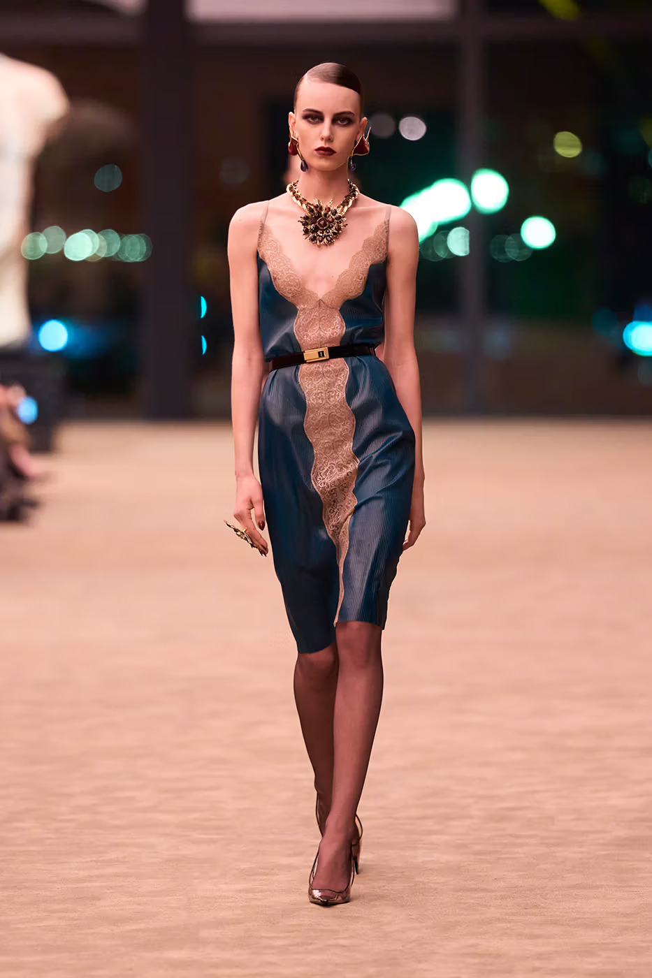 Ревијата беше отворена со низа црни одела со големи ревери и нараменици, потсетувајќи на смокинг за жени кој францускиот дизајнер Ив Сен Лоран го креираше во 1966 година, прекинувајќи ја дотогашната традиција.