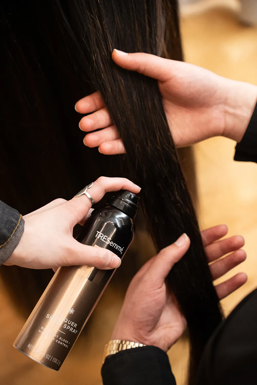 Секој прамен бил внимателно избран за да одговара на бојата на косата на Рина, а потоа бил подготвен со производи од нивната линија пред рачно да биде сошиен на основата на фустанот. За корсетот да добие измазнет и сјаен изглед, тимот на Кован користел крема за измазнување, додека на долниот дел од фустанот со спреј за текстура му дале волумен и движење.