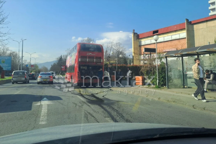 Крајната десна лента на булеварот Христијан Тодоровски-Карпош во Бутел утрово е непроодна оти се расипа уште еден двокатен автобус на ЈСП.