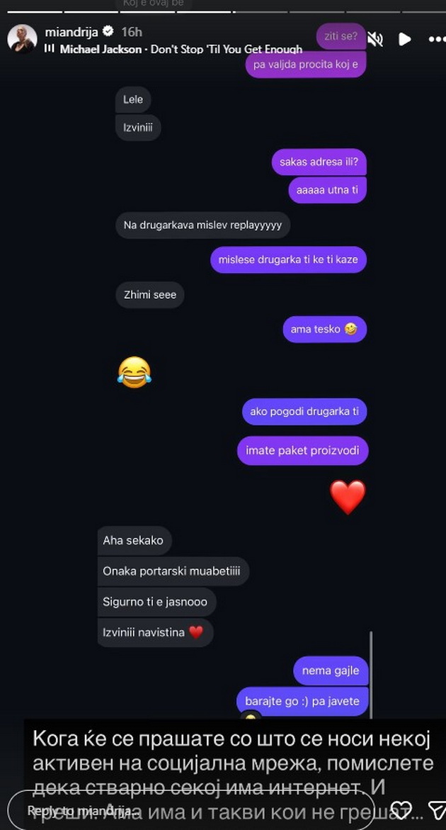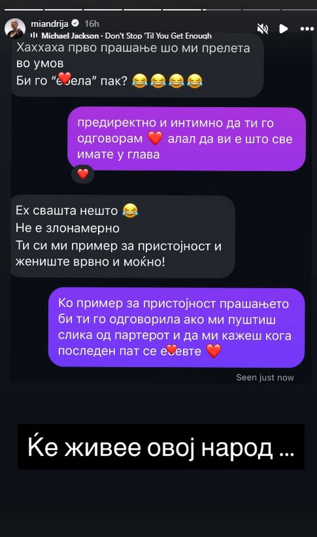 Подоцна, Костова сподели и дел од пораките што ги добива на Инстаграм, посочувајќи колку можат да бидат несоодветни. Таа покажа примери каде непознати лица ѝ поставуваат лични прашања за таткото на детето, па дури и навлегуваат во интимни теми. Па така, една девојка наместо кај другарка ѝ, по грешка ѝ пишала на Миа прашувајќи кој е таткото на Андрија, а друга пак ја прашала дали повторно би имала интимни односи со него.