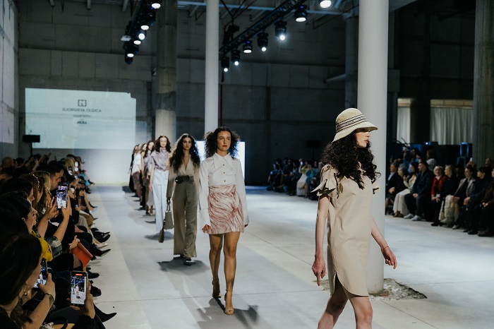 Олгица Ѓоргиева со колекцијата „Metamorfosis“, поддржана од Nera Caffe, понуди тивка, но сигурна завршница. Инспирирана од личната трансформација и симболиката на пеперутката, колекцијата се развива низ минималистички силуети, рачна изработка и прецизно обликувани детали. Природните тонови внесуваат стабилност, додека суптилниот леопард принт се појавува како знак на инстинкт и самодоверба, дискретно, но присутен.