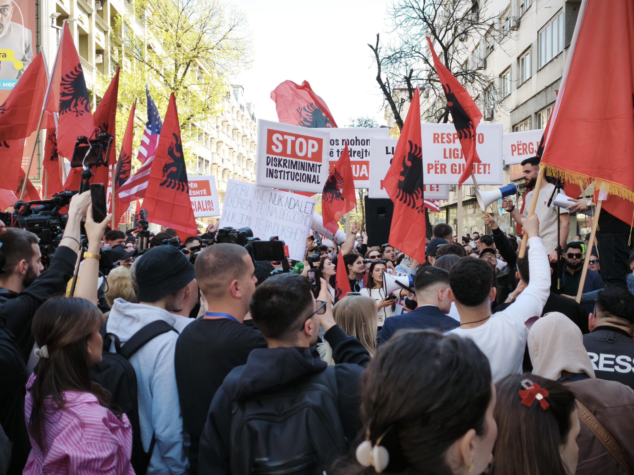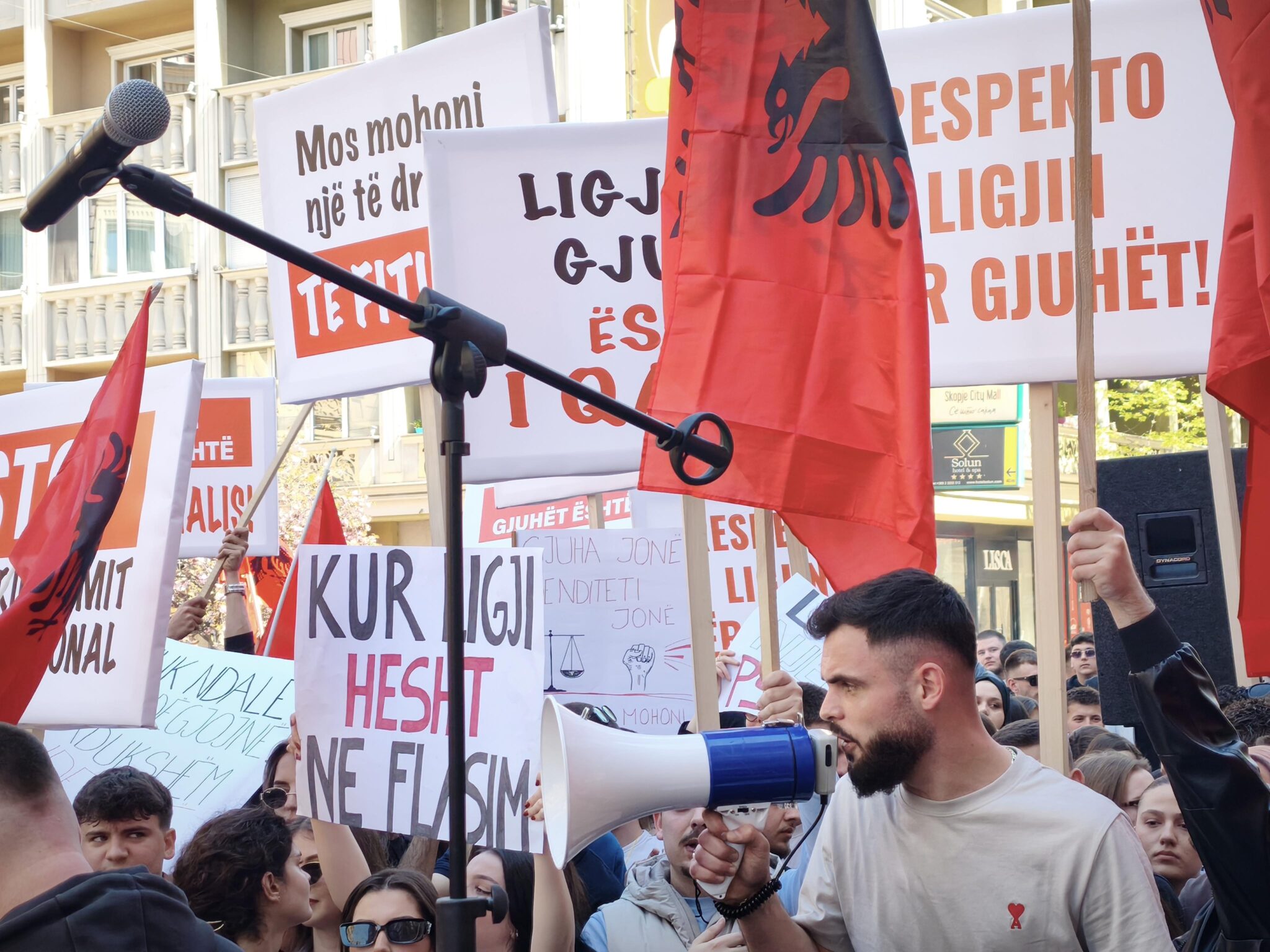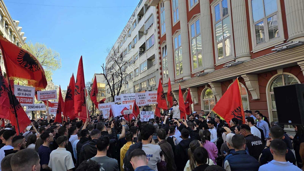 Со албански и американски знамиња, како и со транспаренти „Стоп за институционалната дискриминација“, студенти протестираа барајќи правосудниот испит да може да се полага и на албански јазик.