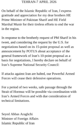 Како одговор на братското барање на премиерот Шариф во неговото соопштение на X, и земајќи го предвид барањето на Соединетите Американски Држави за преговори врз основа на нивниот предлог од 15 точки, како и соопштението на претседателот на САД за прифаќање на општата рамка на иранскиот предлог од 10 точки како основа за преговори, со ова изјавувам во име на Врховниот совет за национална безбедност на Иран: