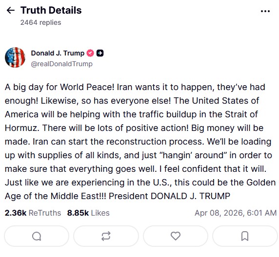 Претседателот на САД, Доналд Трамп, ја поздрави двонеделната пауза во нападите врз Иран како „одличен ден за светскиот мир“. Во објава на социјалната мрежа Truth Social, тој рече дека Иран „водел доволно војни“ и дека „доаѓаат многу позитивни потези“.