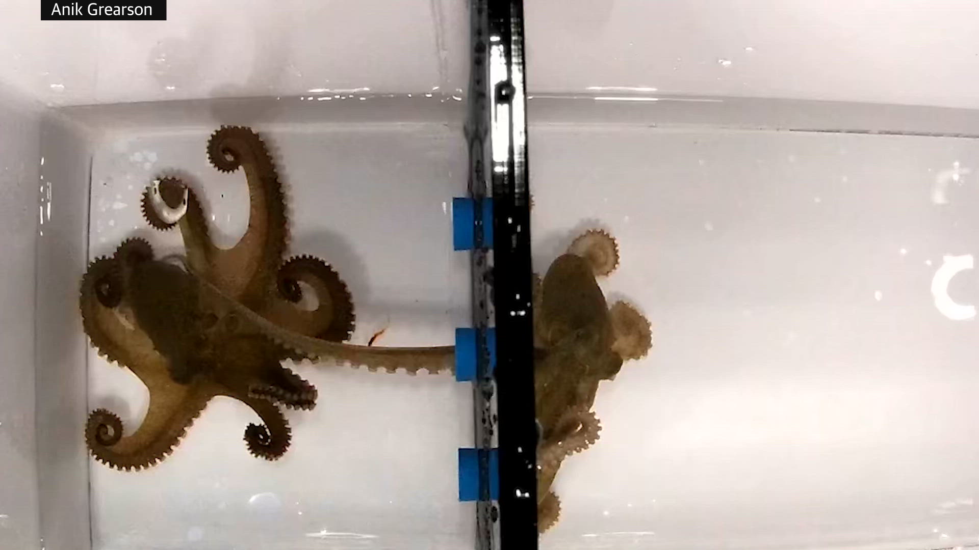 Преградата имала отвори низ кои октоподите можеле да ги протегаат своите пипала и постепено да се „запознаваат“.