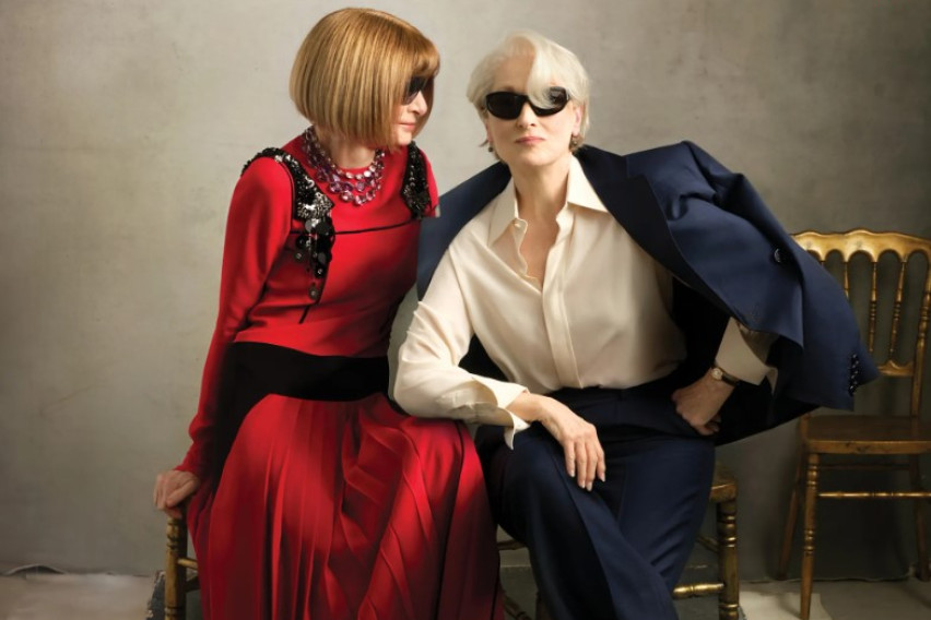 За фотографирањето за насловната страница на „Vogue“, Винтур избра црвен фустан со црни детали, кој го искомбинирала со необични сандали и парчиња накит. Мерил Стрип за оваа пригода избра темносин костум и бела кошула, а комбинацијата ја надополни со црни високи потпетици.