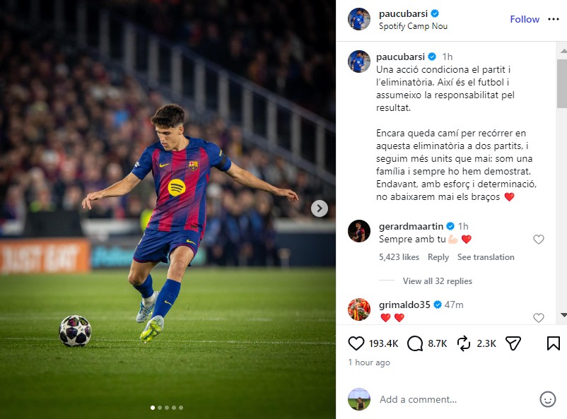 Пау Кубарси го прекина молкот и се јави ова претпладне за директното влијание кое го имаше врз резултатот на натперварот против Атлетико Мадрид, а во својата објава на социјалните мрежи експресно доби голема поддршка од своите соиграчи.