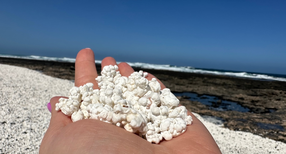 На прв поглед, изгледа како џиновски рид од пуканки. Плажата во близина на Коралех на канарскиот остров Фуертевентура е позната по својата необична мешавина од песок и бели алги, слични на пуканките. Овие варовнички алги се разградуваат од морето со векови сè додека не почнат да изгледаат како крцкави парчиња пуканки. Одлично за фотографирање.