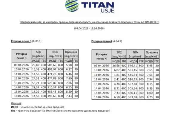 Компанијата „Титан Усје“ соопшти дека емисиите од нејзиното работење постојано се под граничните вредности утврдени со закон.
