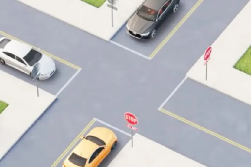 Станува збор за илустрација на раскрсница на која се наоѓаат три автомобили - жолт поставен на дното, бел од неговата лева страна, како и сив кој доаѓа од левата страна на белиот.