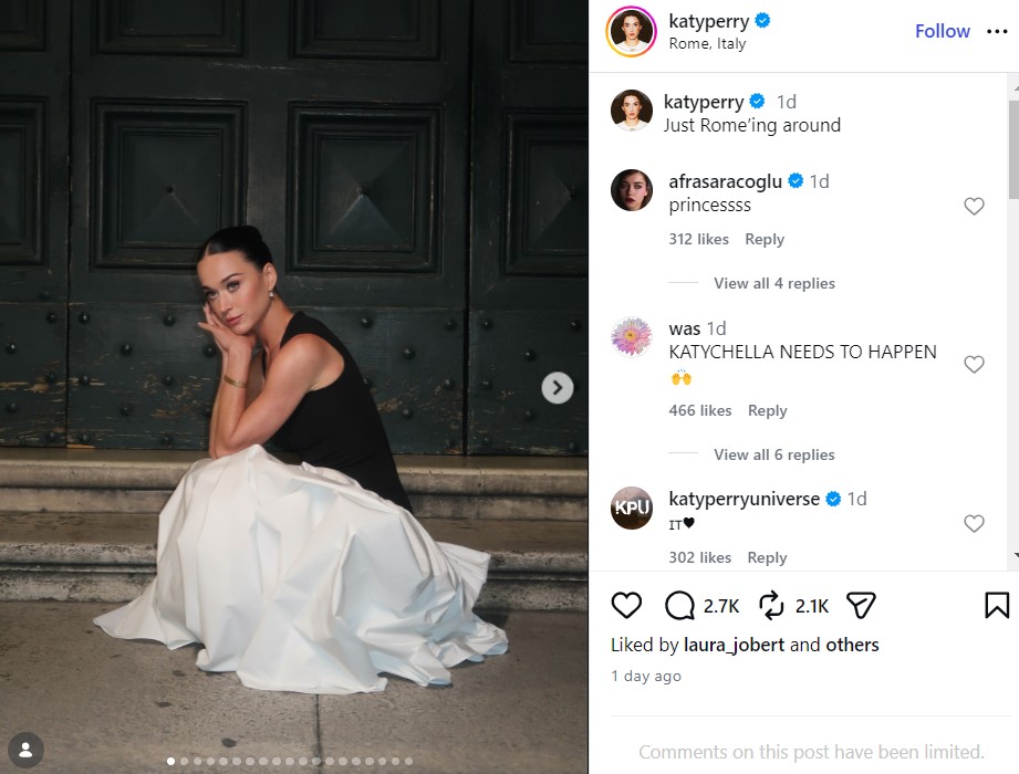 Пејачката споделила и снимка пред базиликата Свети Петар во Ватикан, каде што запеала „Папа Лав, алелуја“, оддавајќи му почит на првиот американски папа. За време на престојот во италијанската престолнина, преку видеоповик разговарала со својата петгодишна ќерка Дејзи Дав, додека се капела. Фотографијата ја објавила на Инстаграм, покривајќи го лицето на девојчето со емотикон од ајкула. Дејзи ја добила со поранешниот свршеник, актерот Орландо Блум (49), со кого Пери се раздели во 2025 година по седум години врска.