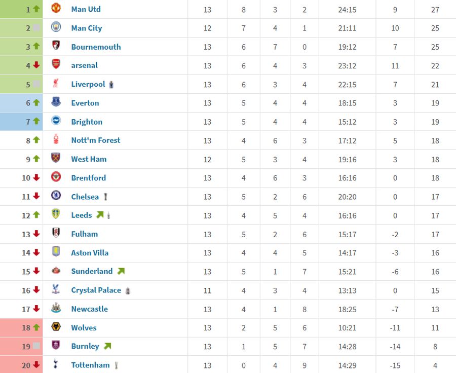 Арсенал кој бележи пад во формата е четвртопласиран во овој период со 22 поени, додека големо изненадување во вториот дел од сезоната е Борнмут кој има собрано 25 бодови на 13 натпревари.