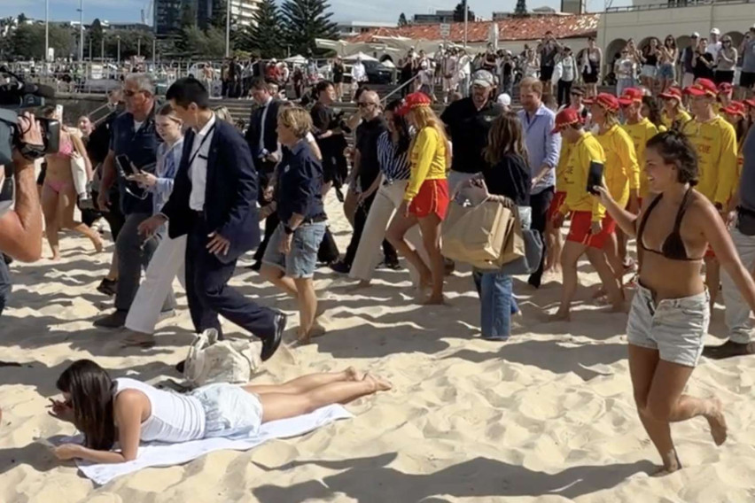 Парот по приватна средба со итните служби и преживеаните од терористичкиот напад на Бонди од 14 декември минатата година, во кој загинаа 15 лица, се упатија кон познатата плажа за да погледнат демонстрација на спасување со штица. Таму ги опкружија десетици обожаватели и голем број медиуми кои го бележеа секој нивни чекор.
