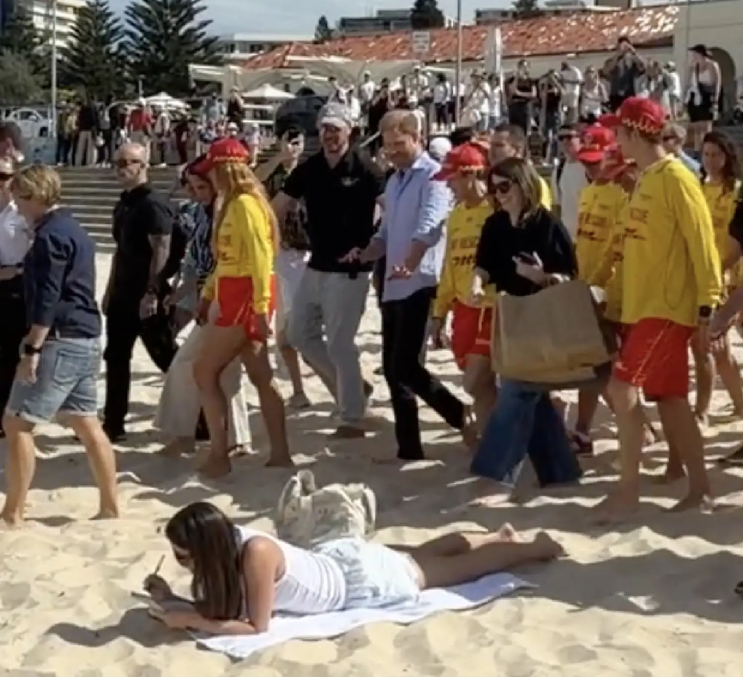 Снимката прикажува како групата ѝ се приближува на капачка која лежи на стомак на пешкир, целосно невознемирена од бучавата околу себе. Жената продолжила да чита книга, без да се обиде да се помести или да ги поздрави угледните гости, дури и откако принцот Хари, како што изгледа, ја забележал и покажал кон неа. Тој момент брзо стана вирален на интернет.
