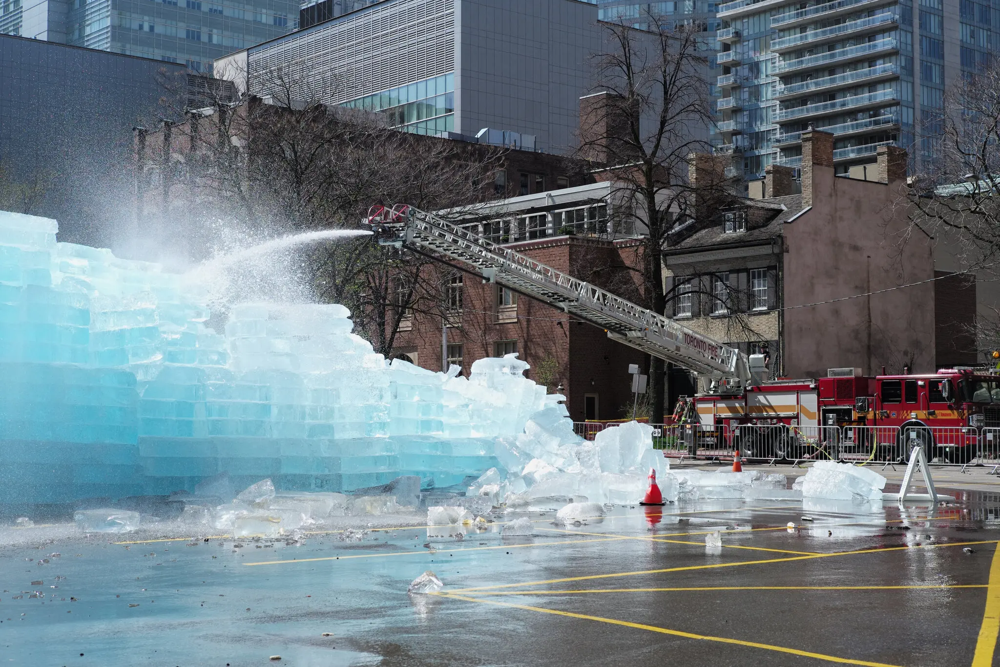 Пожарникарите од Торонто користеа црева со висок притисок и тешки алати за да ја разбијат големата ледена скулптура на канадскиот рапер Дрејк, која привлече стотици луѓе, создавајќи загриженост за безбедноста.