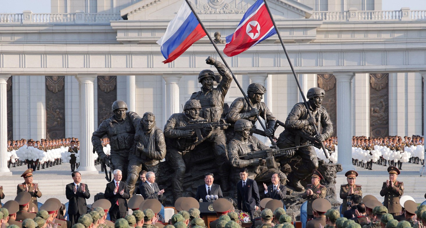 Ким потпиша воен договор со рускиот претседател Владимир Путин во 2024 година, кој вклучува одредба за меѓусебна одбрана. Јужнокорејските и западните разузнавачки агенции проценуваат дека Пјонгјанг оттогаш испратил најмалку 10.000 војници и десетици илјади контејнери со оружје за да ѝ помогнат на Русија во нејзината војна против Украина.